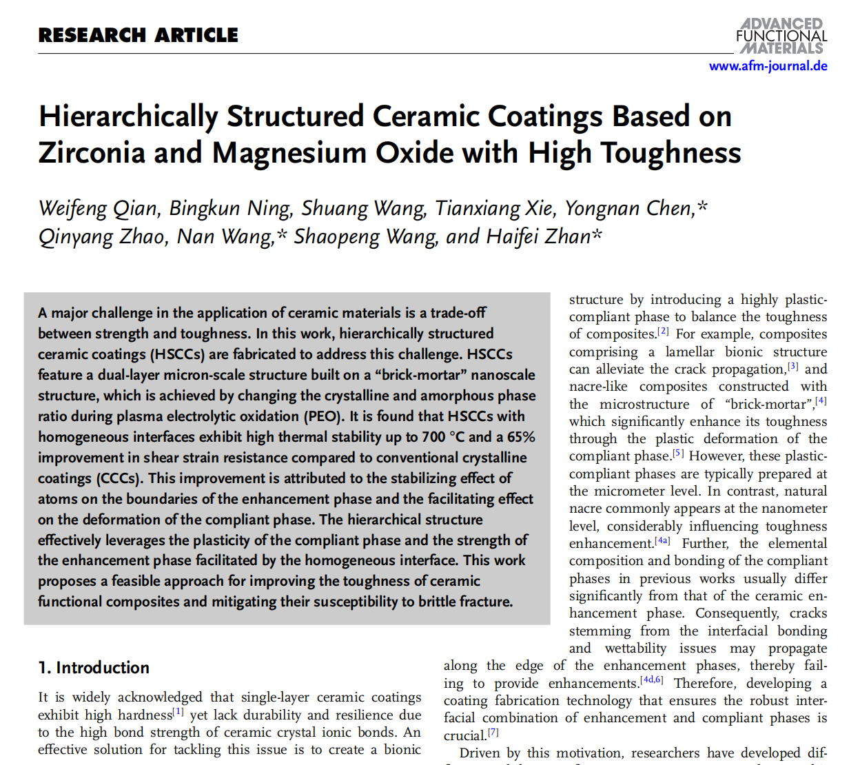 近日,十大买球官网博士生钱伟峰等人在导师陈永楠教授的指导下,在材料科学领域国际期刊《Advanced Functional Materials》(中科院1区Top期刊,IF 18.5)发表论文“Hierarchically Structured Ceramic Coatings based on Zirconia and Magnesium Oxide with High Toughness”。陈永楠教授为第一通讯作者,十大买球的正规网站为第一通讯单位。论文信息陶瓷材料应用中的一个主要挑战是强度和韧性之间的权衡。此研究通过构建多尺度异构结构陶瓷涂层(HSCC)...