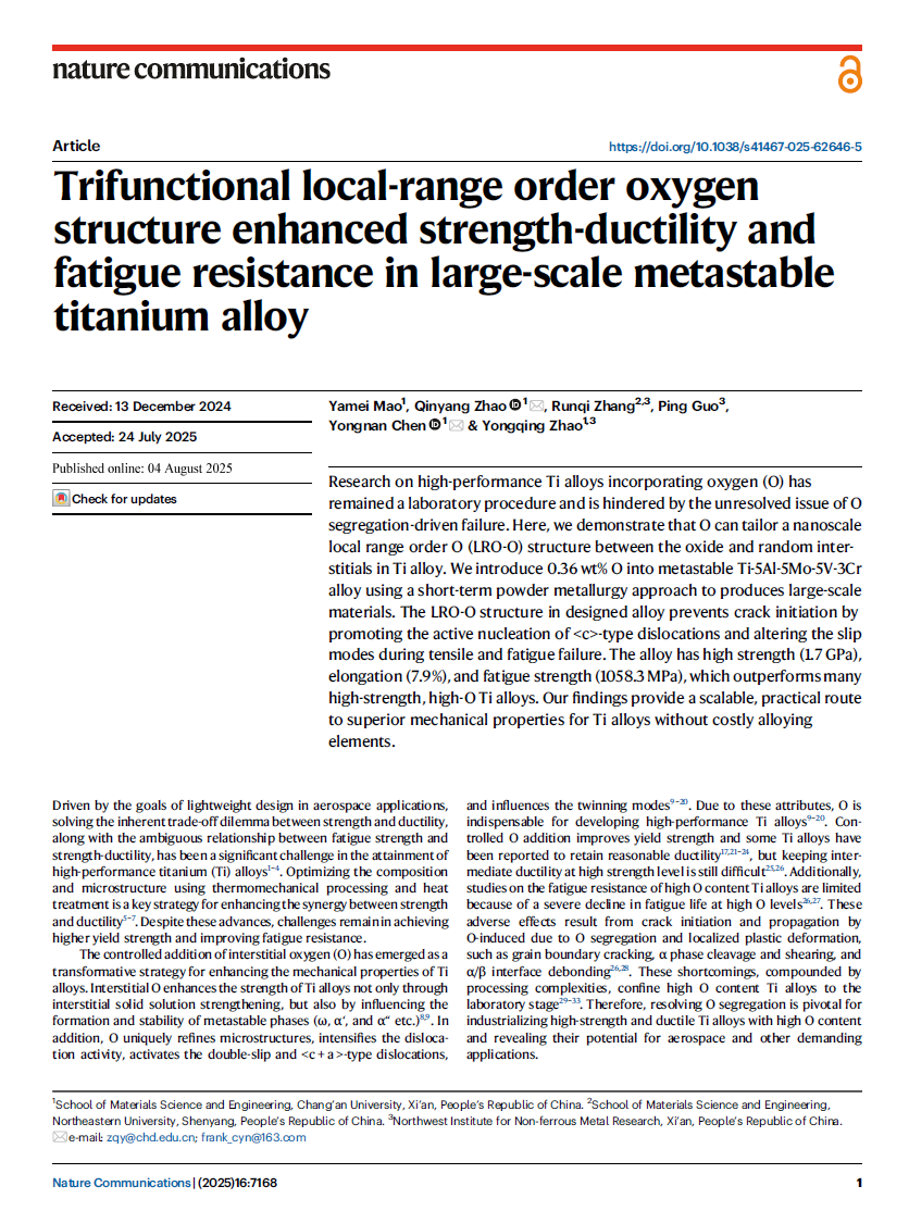 近日,十大买球官网赵秦阳教授、陈永楠教授团队在《自然·通讯》(Nature Communications)在线发表了题为“Trifunctional local-range order oxygen structure enhanced strength-ductility and fatigue resistance in large-scale metastable titanium alloy”的研究论文。博士研究生毛雅梅为第一作者,赵秦阳教授、陈永楠教授为共同通讯作者,十大买球的正规网站为唯一通讯单位。如何解决强度和塑性之间的倒置关系以及疲劳强度和强塑性之间难以协调的问题,...