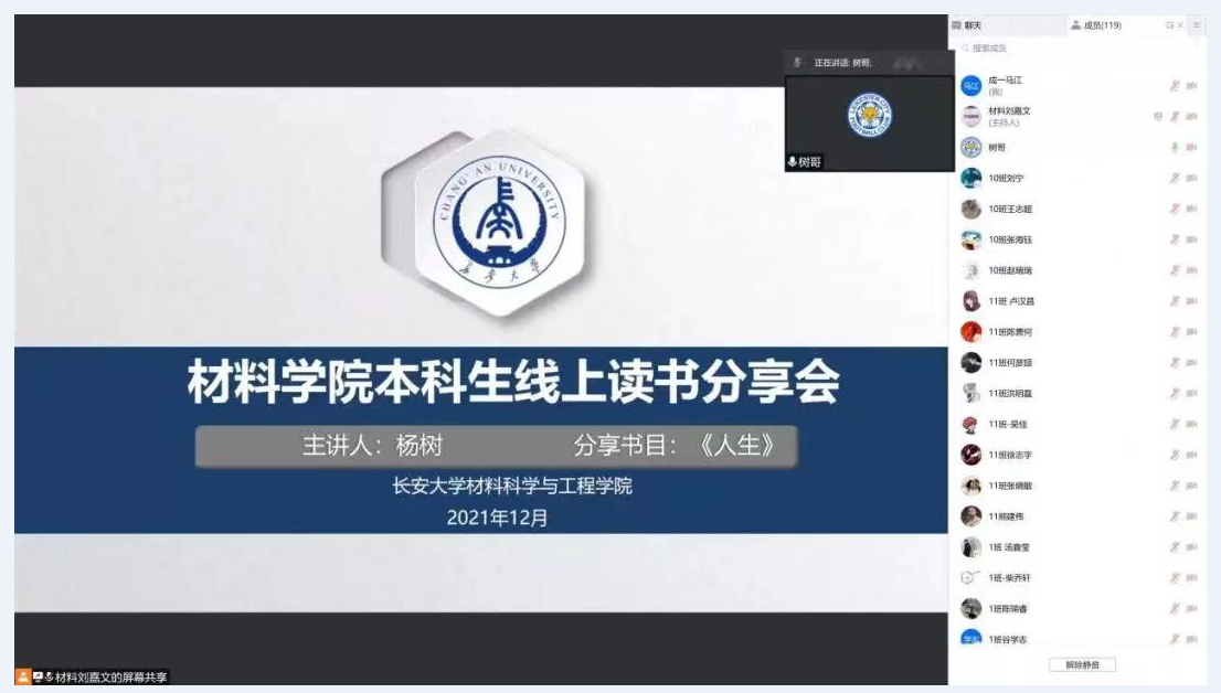 21:00,为了丰富学生的文化生活,充实大家的精神世界,学办主任杨树举办了线上“读书分享会”,他为大家分享了《人生》一书,他说“人生的道路虽然漫长,但紧要处常常只有几步,特别是当人年轻的时候”。同学们也与杨树老师一起,徜徉书海,感受文学的魅力,从自己的生活中走出来,俯视自己的人生,从而更好地为自己的人生道路做出正确的抉择。