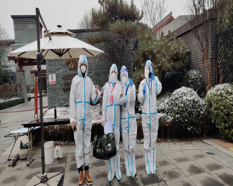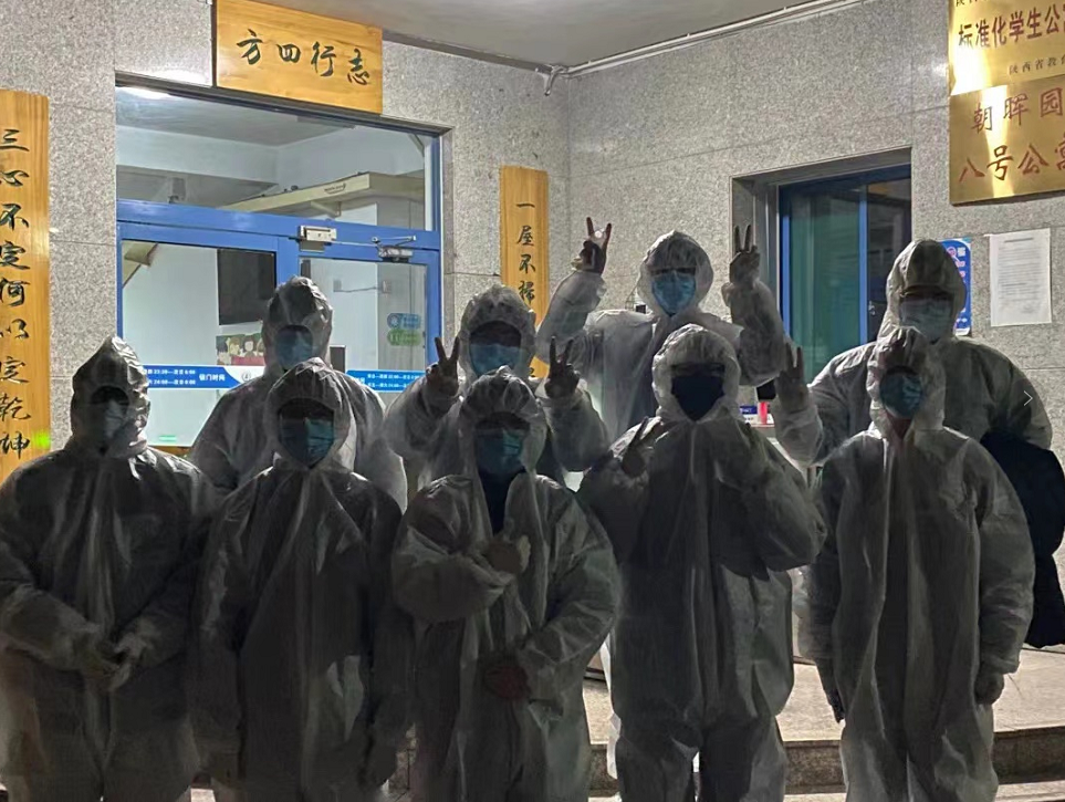 凌晨1点,学院党委书记高雁北还没睡,还有10多个学生志愿者还没睡,他们都在等待15个集中隔离志愿者返校。1月的西安,寒风瑟瑟,志愿者们因为要穿防护服,里面传不了太厚的衣服,站了一会,手脚已经冻透了。但是他们的心是热的,因为他们要迎接最亲爱的同学们返校,让他们感受到母校的温暖。凌晨3点,学生终于回来了。看到这么多人一起陪伴他们一夜无眠,不禁热泪盈眶。