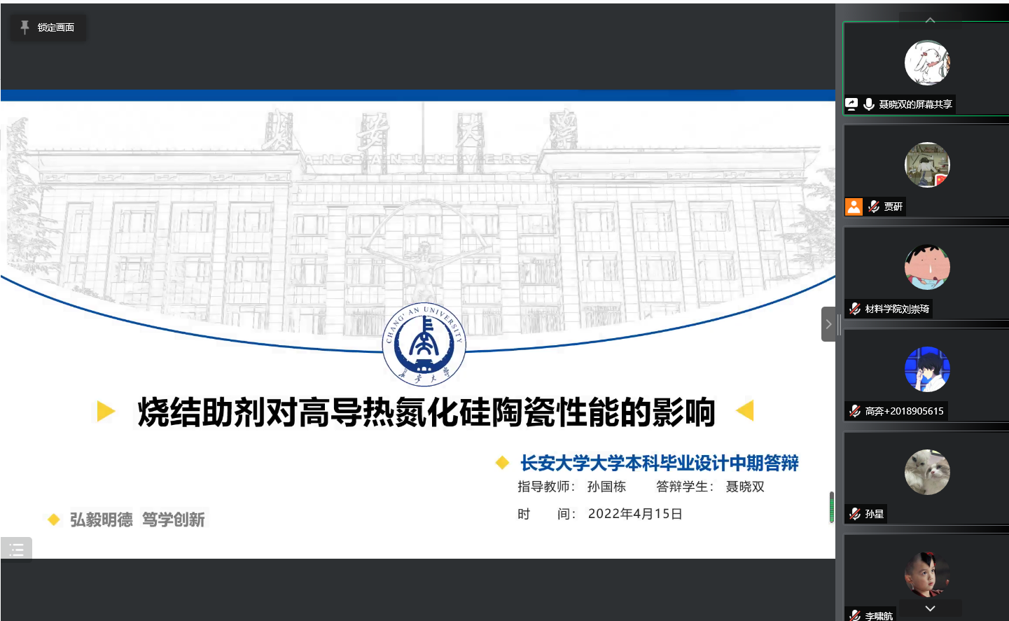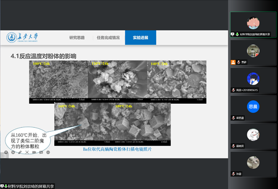 为了切实保障无机非金属材料工程专业本科生毕业设计(论文)质量与执行进度,及时了解和掌握学生毕业设计(论文)进展及完成情况,保证学生顺利完成毕业设计(论文)任务,2022年4月13~18日,十大买球官网无机非金属材料工程系对本专业2022届全体毕业生开展了中期检查工作,并以腾讯会议线上报告形式进行了中期答辩。本系全体教师及2022届毕业生参加了本次答辩,学院督导王利捷老师参与检查与指导。