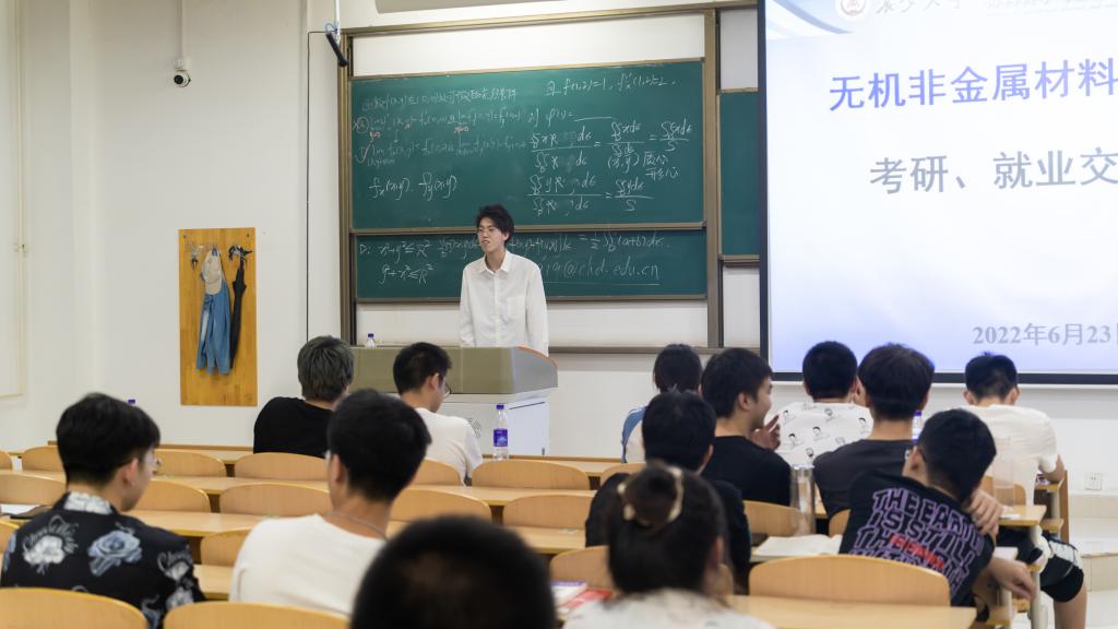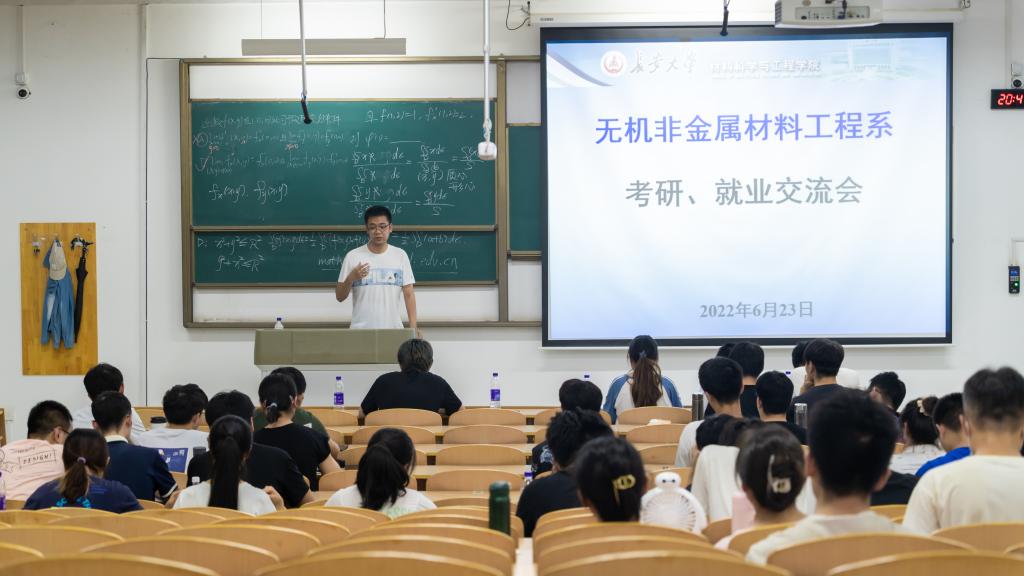 2022年6月23日晚20:30,无机非金属材料工程专业在北校区WH1307教室召开了2019级本科生考研与就业经验交流会,无机非金属材料工程系主任李辉、2019级思政班主任郭成斌老师、2018级5位作经验交流的同学以及2019级本科生参加,交流会由李辉主任主持。