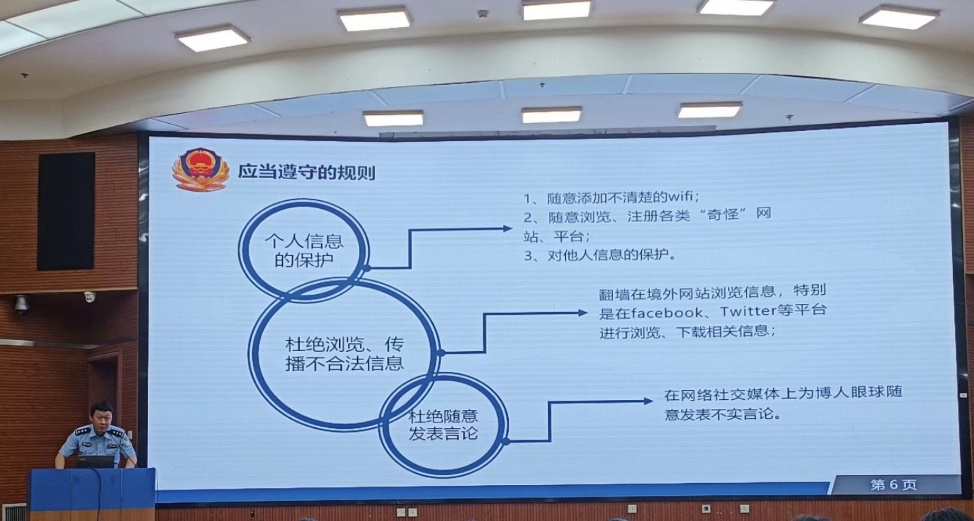 范警官以《增强安全意识和素养,提升安全防护能力》为题,从网络安全、人身安全、财产安全、紧急避险与救助四个方面,展开了深入细致地讲解,提醒学生牢固树立“安全第一”的意识,严格遵守国家法律、法规,妥善保管个人信息,规范文明健康上网,增强防诈防骗意识,以实际行动为校园和谐安全作贡献。讲座运用鲜活的案例以案释法、以事论理,为同学们上了一堂实用、生动的安全教育课。