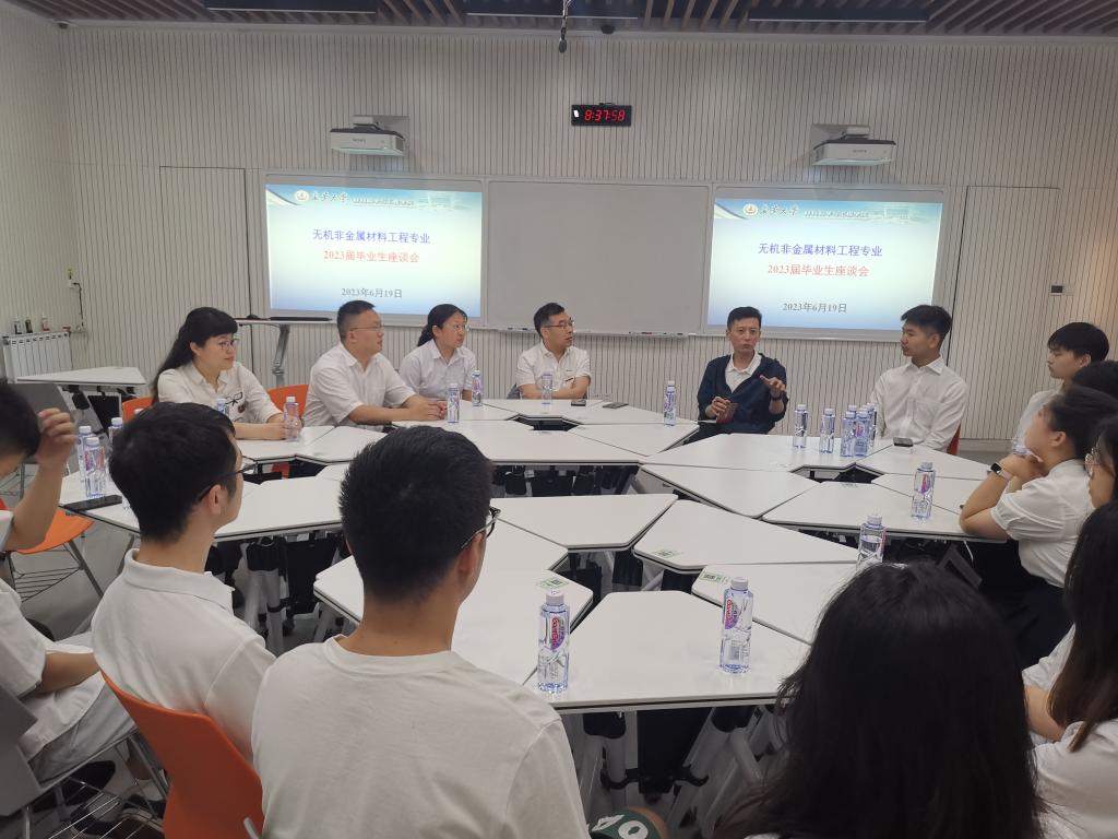 2023年6月19日上午,十大买球官网无机非金属材料工程系在北校区WX2306教室召开2023届本科毕业生座谈会,系主任李辉、副主任孙国栋、思政班主任郭成斌、班主任郑雪萍、郑佳红以及2019310501-02班部分学生代表参加,会议由李辉主持。