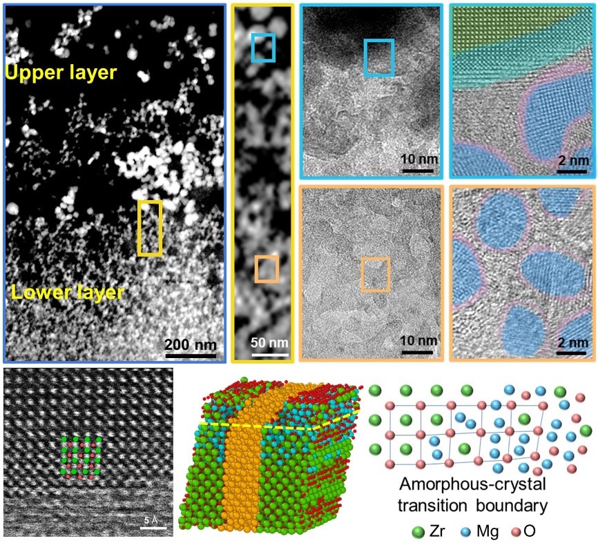 陶瓷材料应用中的一个主要挑战是强度和韧性之间的权衡。此研究通过构建多尺度异构结构陶瓷涂层(HSCC)来应对这一挑战。受天然贝壳启发,研究团队基于“砖-砂”纳米级结构,通过调控强化相(砖)和塑性相(砂)的成分和比例,在膜层中建立了微米级外强内韧的双层结构。研究发现,HSCC具有高达700°C的高相组成和结构热稳定性,与传统晶体涂层相比,其抗剪切应变能力提高了65%。锆原子稳定了增强相的边界,促进了顺应相的变形,使得分层结构能够通过同质相界面有效利用塑性相的变形能力和强化相的强度。这项研究为提高陶瓷功能复合材料的韧性和降低其脆断倾向提出了一种可行的设计和实现方法。