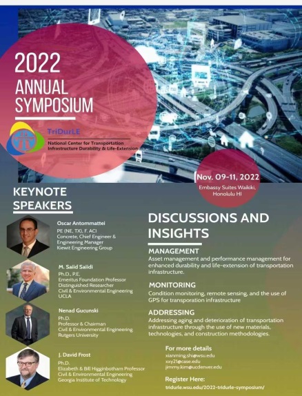 2022年11月9日至11日,由National Center for Transportation Infrastructure Durability & Life-Extension举办的交通基础设施第二届研讨会(TriDurLE 2nd Annual Symposium 2022)在美国夏威夷召开,本次会议主题为“Transportation Infrastructure Durability & Life-Extension”,共有9个分会场,38名国内外行业学者做大会汇报,十大买球官网博士生Ahmed Abdulakeem应邀线上做大会汇报。