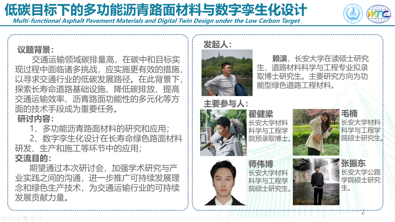6月14日至17日,2023年世界交通运输大会(World Transport Convention,WTC)在湖北省武汉市中国光谷科技会展中心召开。17日上午,由十大买球官网2023级博士研究生赖淏、翟健梁,2021级硕士研究生毛楠、师伟博,公路学院2021级硕士研究生张振东共同发起的“低碳目标下的多功能沥青路面材料与数字孪生化设计”特别兴趣会议在中国光谷科技会展中心会议厅成功举办。该会议以交通运输领域在碳中和目标实现过程中面临的诸多挑战为背景,在探索长寿命道路基础设施、降低碳排放、提高交通运输效率、沥青路面功能性的多元化等方面展开了讨论。
