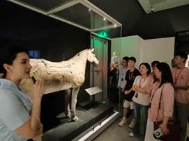 陕西历史博物馆秦汉馆是目前国内唯一一座以集中展示秦汉文明缘起、发展、贡献为宗旨的博物馆。师生一道参观了基本陈列“天下同一——秦汉文明主题展”以及“城与陵”“技与美”两个专题陈列,了解了秦汉文明在中华文明发展进程中的多种成就和作用。秦跪射俑目光炯炯,承载千年凝思;鎏金铜蚕昂首向上,记录丝路传奇;汉代古船融合中外技艺,见证沧海桑田。师生认真观看一个个历史文物,回溯历史长河,感悟中华优秀传统文化的瑰丽。