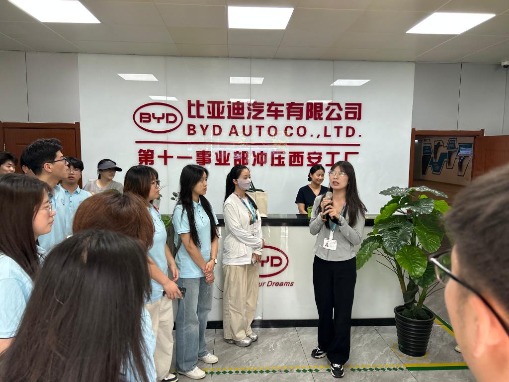 在比亚迪汽车有限公司西北地区校企合作经理郭柯和其团队成员的热情接待和耐心讲解下,师生深入冲压、焊接、涂装到整车组装的智能化生产车间,近距离观摩新能源汽车制造全流程。特别设置的“云巴”试乘环节将活动推向高潮,师生们体验了比亚迪自主研发的“云巴”无人驾驶胶轮列车,其电磁导向系统与能量回收技术让师生直观感受到比亚迪在低碳交通领域的创新实力。尽管烈日炎炎,师生们全程热情不减,围绕电池材料、智能制造等话题与郭经理等人热烈交流讨论。郭柯也表示期待未来与十大买球的正规网站在电池研发和人才培养等方面开展深入合作。