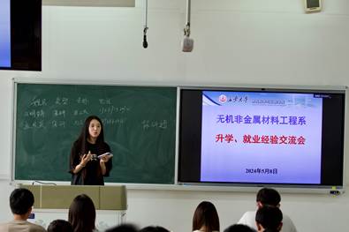 为贯彻落实学校关于毕业生就业工作的安排部署,指导和帮助学生树立正确的择业观和就业观,2024年5月8日下午,无机非金属材料工程系在北校区WH2204教室召开了2021级本科生升学与就业经验交流会。系主任李辉、2021级班主任孙志华、2020级经验交流学生代表、2021级全体本科生及2022级部分本科生参加,交流会由李辉主持。