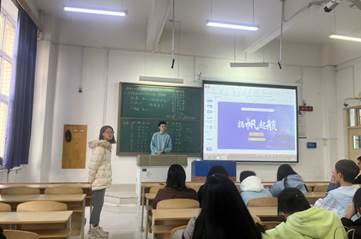 在分享环节中,张佃康结合个人参赛经验,从参与科技竞赛的“目的”“认识”“准备”和“核心”四个方面入手,详细介绍了学校及学院各类科技竞赛的类别、参赛时间节点、竞赛难易程度等关键信息。班主任郭豪彦强调了科技竞赛对于学生综合素质提升的重要性,鼓励同学们积极参与进来,主动培养自己的创新和竞赛意识。班主任鲍晓冰就如何平衡学习与竞赛方面与张佃康进行了交流,并向同学们分享了一些自己的建议和技巧。