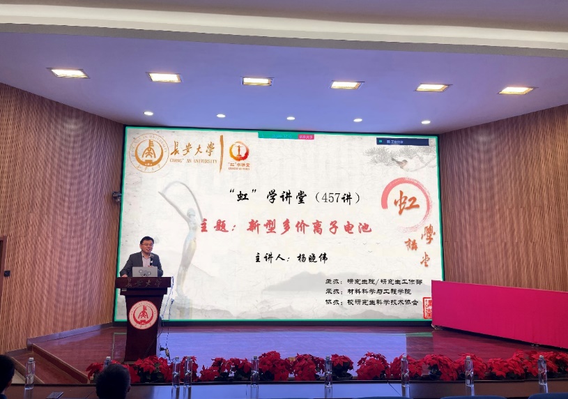 报告伊始,郭亚杰副院长首先感谢杨晓伟教授的到来,并介绍了杨晓伟教授的基本情况和科研成就。报告中,杨晓伟教授结合世界资源储量丰度及金属离子的电化学性能参数详尽分析了多价离子电池在“后锂时代”的选择,指出以镁、锌为代表的多价金属离子电池体系是极具发展潜力的下一代储能体系,但其在实际应用上也存在诸多严峻挑战。针对多价离子电池循环寿命短等问题,杨晓伟教授带领团队从分子层次的溶剂化离子结构进行调控、从单元层次的复杂界面传递过程进行解耦,并对系统层次的电池器件组装问题开展了系列研究,逐步提升了镁离子二次电池的循环稳定性。针对水系锌离子电池的锌负极界面稳定性差的现象,杨晓伟教授揭示了Zn+ 与水偶极作用而引发的析氢反应是影响电池安全性及稳定性的制约因素。最后,杨晓伟教授对如何提高锌离子电池安全稳定性,提出应进行电解质调控、界面配位层设计、致密SEI保护层的析氢抑制策略。